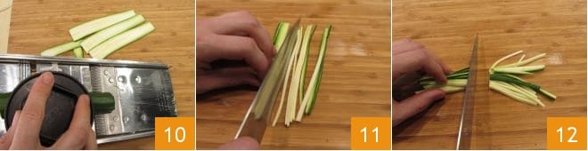 Also, wash the zucchini well and, using the mandoline, cut slices of the same thickness as the carrots (1/8 inch) 10. Cut these slices into julienne strips 11 and then again in half 12.