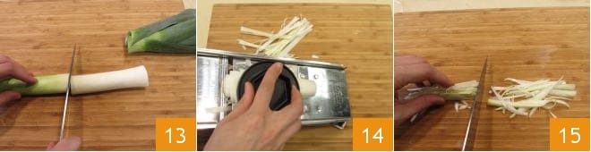 Take the leek, remove the greener parts and leaves, and make a vertical incision to take only the central part, then cut it in half 13. Pass this through the mandoline as well 14 and cut the leek strips in half again 15.