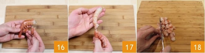 Clean the shrimp by removing the head 16, shell 17, and internal intestine. Place them on a cutting board and coarsely chop them 18 with a knife.