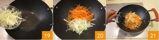In a wok, heat the vegetable oil and add the leek 19 and carrots 20. Let them soften for a couple of minutes and add about half of the soy sauce 21.