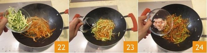 At this point, also add the zucchini 22 and season with the remaining soy sauce 23. Cook everything for another 2-3 minutes, turn off the heat, add the shrimp 24, and mix everything.