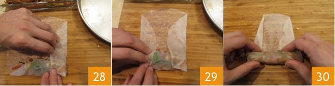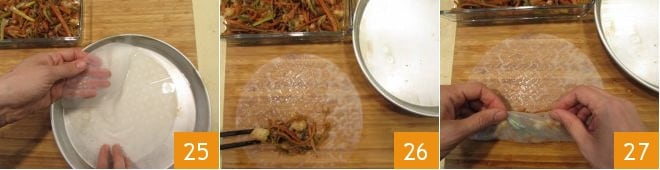 Rehydrate the rice paper sheets in water 25, place them on a cutting board, and fill them with the filling, leaving an outer edge of about 1/2 inch 26. Fold the longer side of the rice paper sheet over the filling 27.