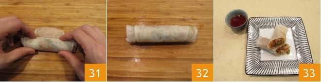 Roll all the way to the end 31 to perfectly seal your rolls 32. Repeat this operation for the other rice paper sheets until the filling is used up. Serve your Vietnamese rolls with the sweet and sour sauce 33.