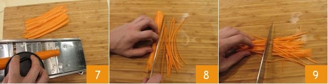 Once the sauce is prepared, focus on preparing the vegetables. Wash the carrots well, peel, and trim them. Using a mandoline, cut slices about 1/8 inch (2 mm) thick 7. Cut them into julienne strips 8 and then in half again 9.
