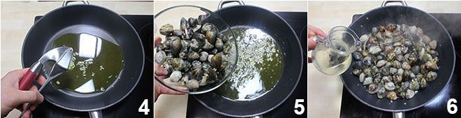 and sauté the garlic cloves, peeled and crushed 4. Drain the clams and add them to the pan 5, pour in the wine 6, and continue cooking over medium heat for a couple of minutes until the wine has completely evaporated.
