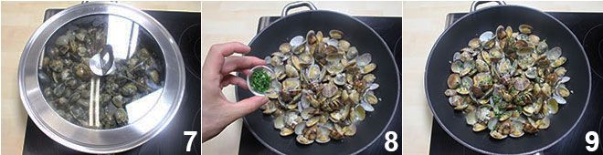 Cover with a lid and cook for another 2 minutes 7. When all the clams have opened well, add a sprinkle of chopped parsley 8, toss them a couple of times, and your fisherman's style clams 9 will be ready to serve!