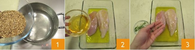 To make the warm spelt with honey chicken, first bring a large pot of salted water to a boil, then add the spelt 1 and cook it for the time indicated on the package. In the meantime, prepare the marinade for the chicken: place the chicken breast in a bowl, add the oil, honey 2, and thyme leaves 3, salt, and pepper to taste,