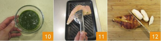 Transfer the pesto to a small bowl 10, cover it with cling film in contact, and set it aside for the moment. Now heat a grill well, place the chicken breasts 11 and cook them for about 4-5 minutes per side (cooking time may vary depending on the thickness of the slices), so that the surface caramelizes. Once grilled, transfer the chicken breast to a cutting board and cut it crosswise into slices, as if it were a tagliata 12.