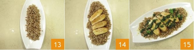 At this point, you're ready to assemble the dish: add about 2 tablespoons of spelt to the base 13, place 3-4 slices of chicken 14, and season with a spoonful of light pesto 15. If desired, you can garnish the dish with a drizzle of oil, lemon zest, and a few flakes of Maldon salt, after which your warm spelt with honey chicken is ready to be served!