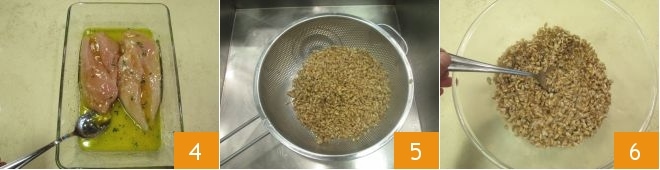 then turn the slices on both sides to ensure the meat is evenly flavored 4 and set it aside for the moment. After the spelt cooking time has elapsed, drain it 5 and transfer it to a large bowl, season with a drizzle of oil, mix 6, and let it cool slightly.