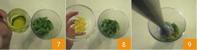 In the meantime, you can prepare the light pesto: in a tall, narrow container, combine the basil leaves, oil 7, grated lemon zest, salt, and pepper, then blend with an immersion blender 9 until a smooth consistency is achieved.