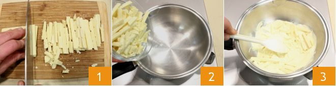 To prepare the white chocolate cakes with Maraschino cream, start with the cake batter: roughly chop the white chocolate 1, then melt it in a bain-marie 2 (the water in the pot should not touch the container in which you pour the chocolate) stirring with a wooden spoon 3.