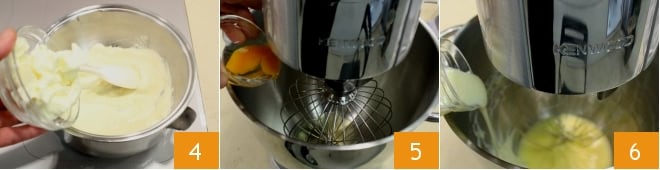 Once completely melted, add the butter and mix it into the chocolate 4. In the bowl of a stand mixer, place the eggs and whip them with the whisk 5; when they are white and frothy, add the condensed milk 6.