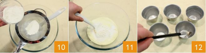 Add the sifted flour 10 and mix with a spatula to combine it into the mixture 11. Butter aluminum molds (about 3.4 oz capacity) using a kitchen brush 12.