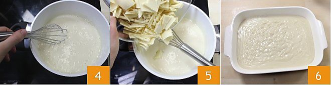 Transfer the mixture into a saucepan and let it thicken over low heat 4, stirring continuously. Finally, add the white chocolate cut into shavings and continue cooking until it is completely melted 5. The white chocolate pastry cream without eggs is ready 6: transfer it to a wide, shallow container, cover it with cling film, and once cool, store it in the refrigerator until ready to use.