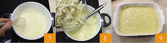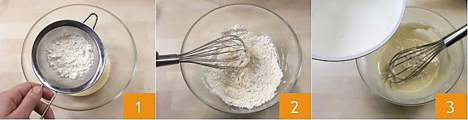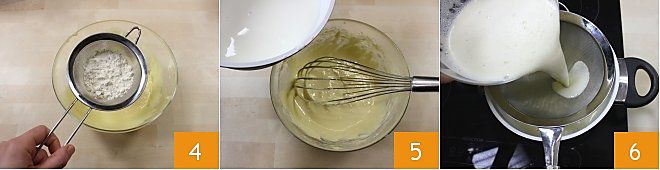 then add the sifted flour little by little 4 and finally the milk 5, now warm. Mix all the ingredients very well then transfer the mixture into a pot, filtering it with a sieve to remove any lumps 6.