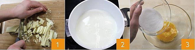 For those intolerant to eggs or simply prefer a lighter version, it is possible to make white chocolate pastry cream by replacing the eggs and sugar with condensed milk, here's how: chop the chocolate into shavings and warm the milk over low heat, then mix the sifted flour and condensed milk in a bowl (1-2). Gradually add the warm milk 3, continuing to stir to avoid forming lumps.