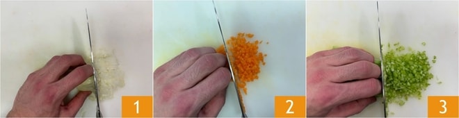 To make the white ragù and zucchini lasagna, start by preparing the How to make the soffritto: clean and chop onion 1, carrot 2, and celery 3.