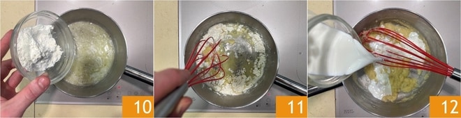 Pour the flour into the melted butter 10 and mix with a whisk 11 to obtain a roux. Then add the previously warmed milk (slightly lukewarm) to the roux and blend the entire mixture, stirring well with the whisk 12.
