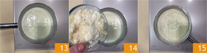 Cook over low heat until the mixture thickens 13, then turn off the heat and add the grated Parmesan Reggiano 14. Mix well to obtain a sort of creamy béchamel sauce 15.