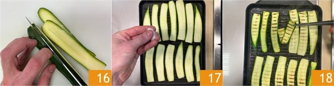 Move on to the zucchinis: wash and trim them, then cut them lengthwise into slices about a quarter-inch thick 6. Place the slices on a hot grill and salt 17. Grill the zucchinis on both sides 18.