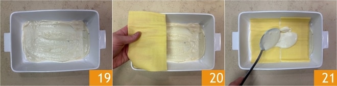 You are ready to assemble the lasagna: take a rectangular baking dish of 8x12 inches, spread a layer of Parmesan cream at the bottom 19, then place a layer of pasta sheets 20 and cover with more cream 21.