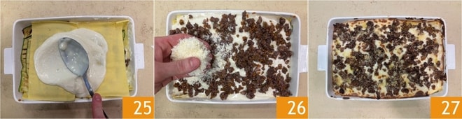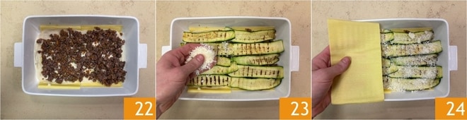 Distribute a layer of ragù 22 and one of zucchinis, then sprinkle the surface with grated Parmesan 23. Continue alternating the layers in this way until you have used up all the ingredients 24; you should get a total of 4 layers.