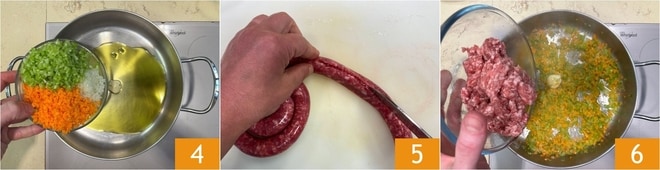 In a pot, heat a drizzle of oil with a clove of garlic, then add the vegetables for the sofritto 4. Sauté for at least 10 minutes to soften the vegetables, then add the chopped rosemary. Remove the casing from the sausage 5 and crumble it into the pot 6. Salt, pepper, and brown the sausage for a few minutes.