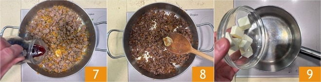 Deglaze with red wine 7 and let it evaporate. Also, pour in hot water and cook the ragù for about 10 minutes. When the sausage is tender and well-cooked, turn off the heat and remove the garlic clove 8. Now prepare the cheese cream: in a small pot, heat the milk (it should not come to a boil), while in another, melt the butter 9.