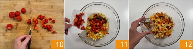 Cut the strawberries into pieces 10 and put them in the bowl 11. Add the cinnamon sticks 12 and give it a stir.