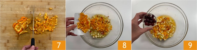 Do the same with the orange 7 and add the citrus fruits to the bowl 8. Add the grapes 9; if the grapes are too large, you can cut them in half.