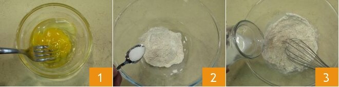 To make the whole wheat crepes, beat the whole egg 1, and in another small bowl, melt the butter. Pour the whole wheat flour into a larger bowl, add the salt 2, then gradually pour in the milk 3 while stirring with a whisk, to prevent lumps from forming.
