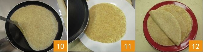 and 2 minutes on the other 10. As the whole wheat crepes are ready, place them on a plate 11 and then fill them with sweet or savory ingredients of your choice 12!