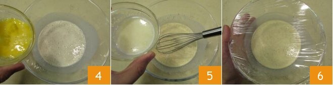 Once the milk is absorbed, add the beaten egg 4 and the melted butter at room temperature 5, continuing to stir with the whisk to obtain a homogeneous batter. Cover the bowl with plastic wrap 6 and let it rest in the refrigerator for 30 minutes.