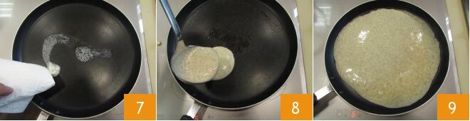 Heat a crepe maker or a non-stick skillet about 8 inches in diameter, grease the bottom with a little butter 7, and pour a ladleful of batter 8. Tilt the pan to allow the mixture to spread evenly on the bottom and cook for 3 minutes on one side 9