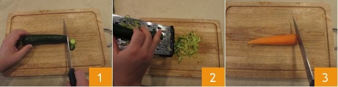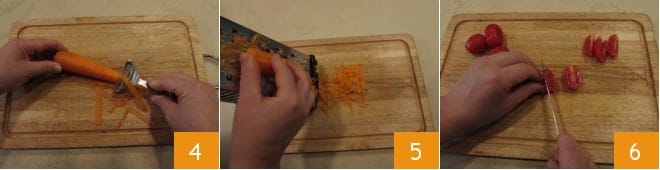 and peel it 4, then grate it also with a coarse grater 5. Then take the cherry tomatoes and cut them in half 6.