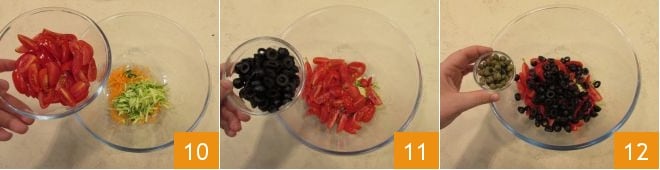Then add the cherry tomatoes 10, olives 11, and desalted capers 12.