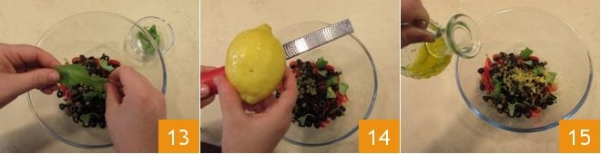 Coarsely chop the basil 13 and grate some untreated lemon zest for a citrusy touch 14. Drizzle with a bit of raw olive oil to enhance the flavor 15.