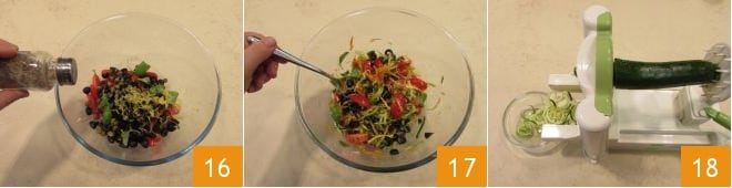 Season with salt and pepper 16 and mix all the ingredients 17. Your sauce is ready: set it aside. Now move on to the vegetables for decoration. Trim the zucchini, then create vegetable spirals with a spiralizer 18.