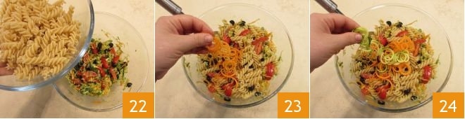 Drain them while still al dente directly into the bowl with the raw vegetable sauce 22 and mix well. Add the spiralized carrots 23 and the decorative zucchinis 24.