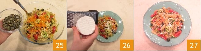 Then add the pumpkin seeds 27. Now plate your whole wheat fusilli alla crudaiola with vegetables, pumpkin seeds, and salted ricotta by grating plenty of salted ricotta 26, garnish if you like with some basil leaves and… enjoy 27!
