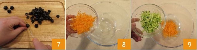 Slice the olives into rounds 7. Take a large bowl and add the carrots 8 and zucchinis 9.