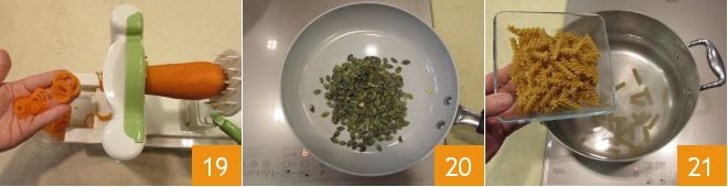 Repeat with the carrot after peeling it 19. If you don't have a spiralizer, you can use a mandoline to get very thin strips of zucchinis and carrots, which you can then cut into thin strips with a knife. Set aside the decorative vegetables. Toast the pumpkin seeds for 1 minute in a non-stick pan 20 and set them aside. Cook the whole wheat fusilli in plenty of salted water 22.
