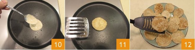 When the pan is hot, pour a tablespoon of the mixture, forming a circular and not too large pancake 10; cook it for a few minutes, and when bubbles form on the surface, flip it with a spatula 11 and continue cooking on the other side. Continue this way with the rest of the batter, and transfer the cooked pancakes to a plate 12.