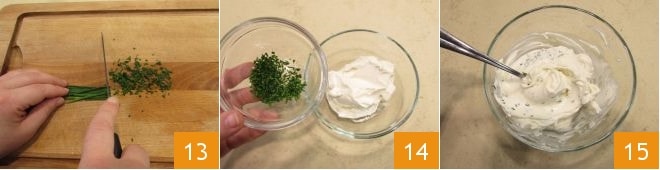 In the meantime, prepare the cream for the filling: finely chop the chives 13, pour them over the cheese 14, and mix thoroughly with a spoon 15.