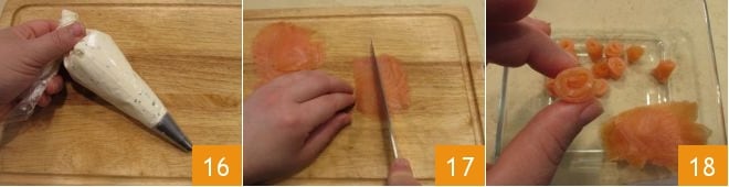 Then transfer it to a disposable piping bag with a star nozzle 16 and keep it in the fridge until use. Now focus on the decoration: cut the salmon into strips 17 and roll them into roses about 0.1 oz each 18.