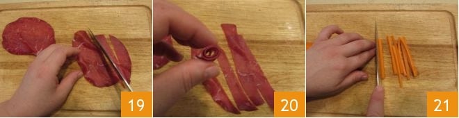 Cut strips of bresaola 19 and roll them as you did for the salmon 20. Peel the carrot and cut it into thin sticks for the final decoration 21.