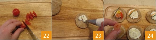 Cut the cherry tomatoes into small slices 22 and set them aside; they will also be used for decoration. Decorate the now cold pancakes with a dollop of cheese cream 23 and a rose of salmon or bresaola 24.