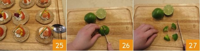 Complete with sweet corn 25, carrot sticks, tomatoes, chives, and a pinch of pepper, arranging the ingredients according to your imagination. Keep the pancakes cool until ready to serve. Meanwhile, prepare the non-alcoholic mojito: cut the limes in half, divide them into two parts 26, and then cut them again into small wedges 27.