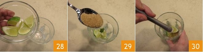 Place four lime wedges in a highball glass 28, add a tablespoon of brown sugar per glass 29, and muddle the mixture with a cocktail pestle 30, releasing the lime juice and partially dissolving the brown sugar.
